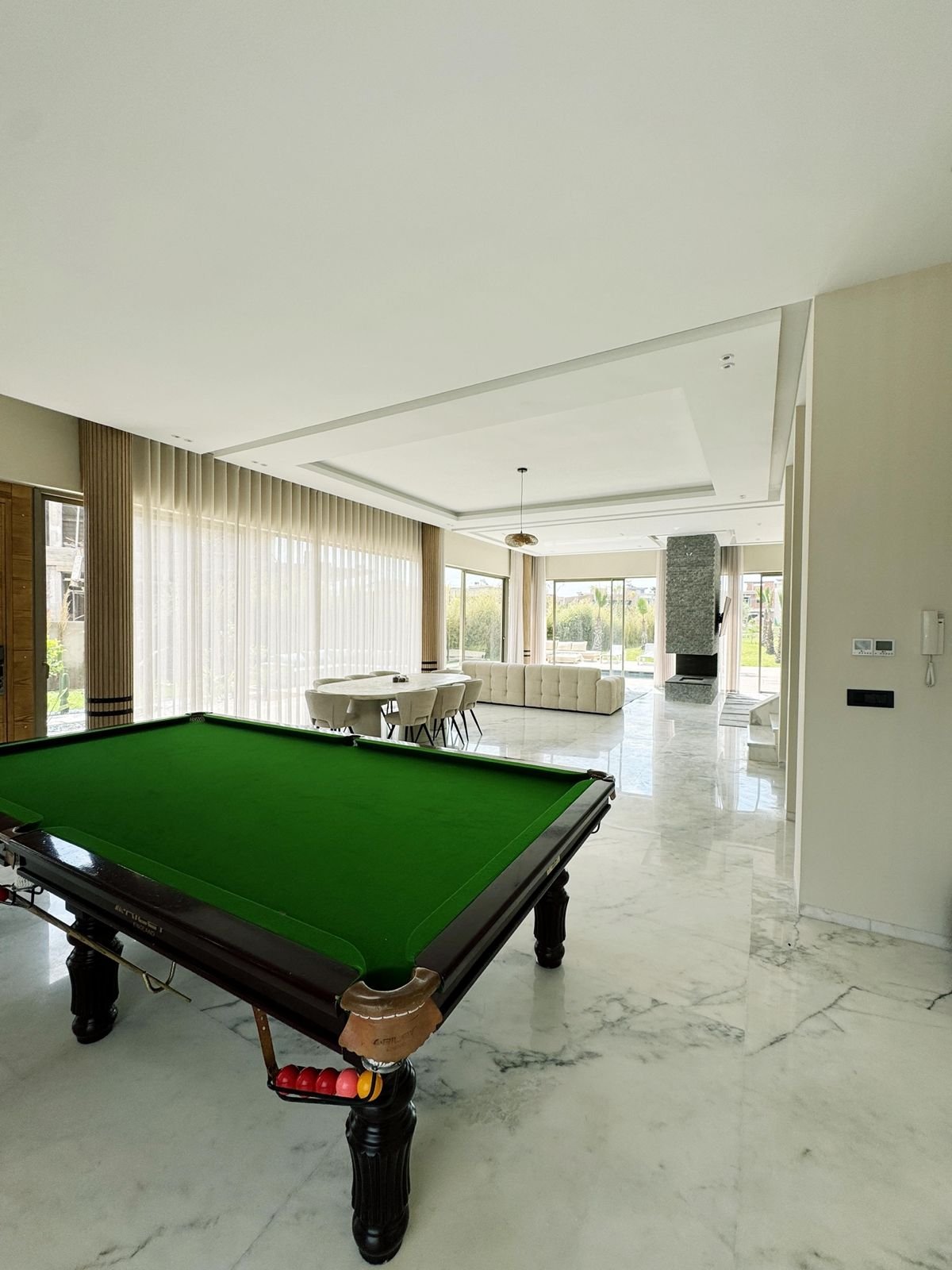 Spacious modern living room with a billiards table, marble flooring, and panoramic windows at Villa Maymouna in Marrakech.