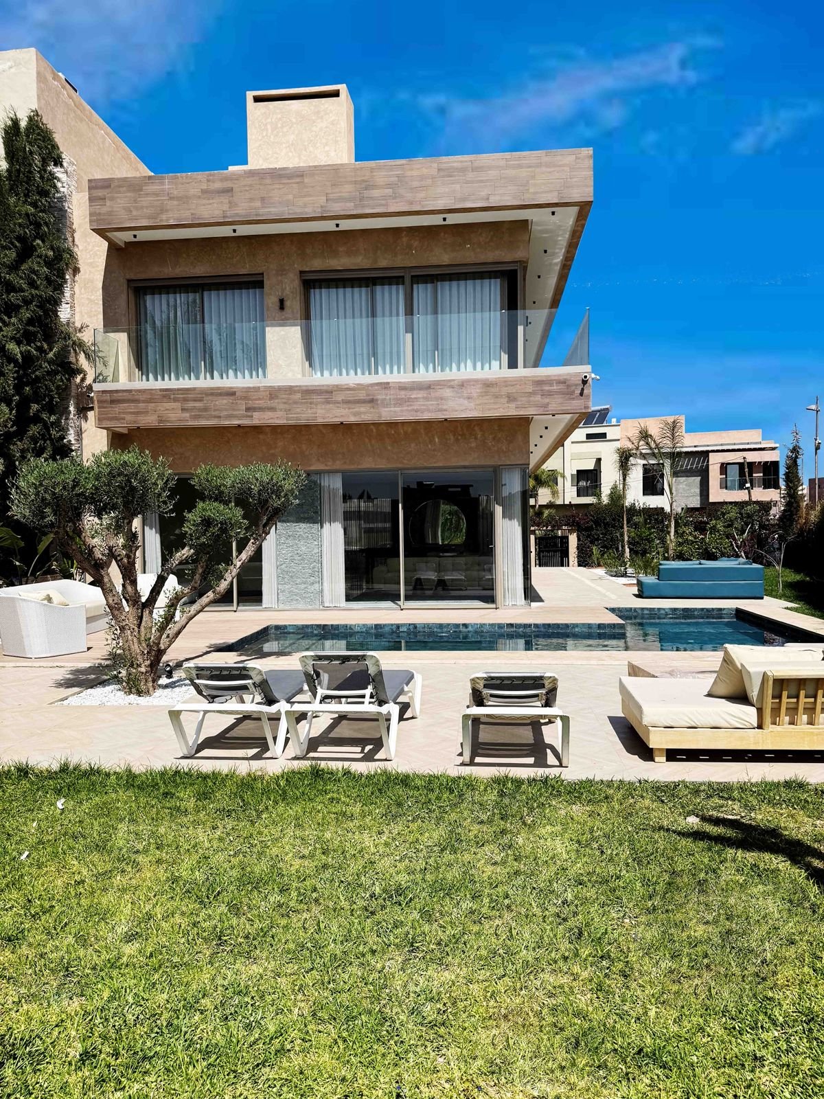 Front view of Villa Maymouna in Marrakech with a large green garden, private pool, sun loungers, and contemporary architectural design.